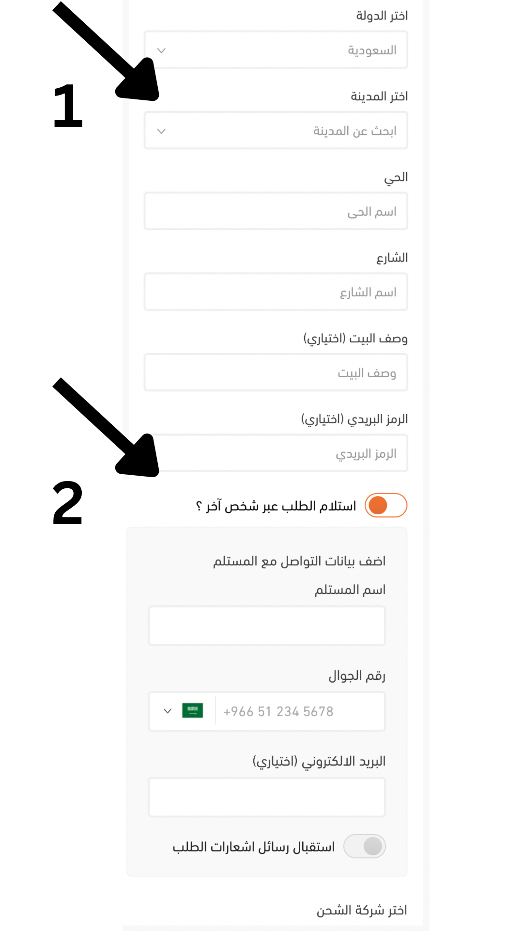 عند رغبتك بوصول الطلب الى مستلم آخر كـ هدية مثلا فضلا اتبع الآتي :